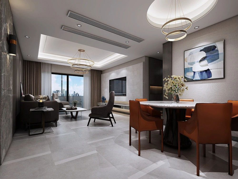 設計選用的石材與皮質的結合中古而冶煉。用餐區沒有被隔離開,與客廳相鄰,配以兩盞溫暖的垂懸吊燈,空間向上延展,連貫整個水平軸向,進行空間與時尚的親暱銜接,拉闊質蘊,建立起更為融洽的舒適氛圍。